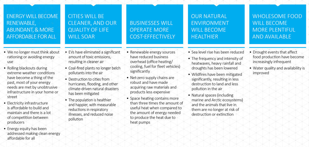 Visualizing a net zero world enables us to better understand the transformative outcomes we can reach—and helps give us the momentum we need to work to attain them. The good news is, much or all of this is very achievable—but only if we act now, proactively and aggressively, to move toward net zero by 2050.