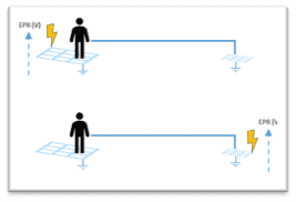 Conductive coupling happens when there is a fault in a system that is connected to earth. Current will flow through the conductor and the earthing system during fault conditions, creating an Earth Potential Rise, or EPR.